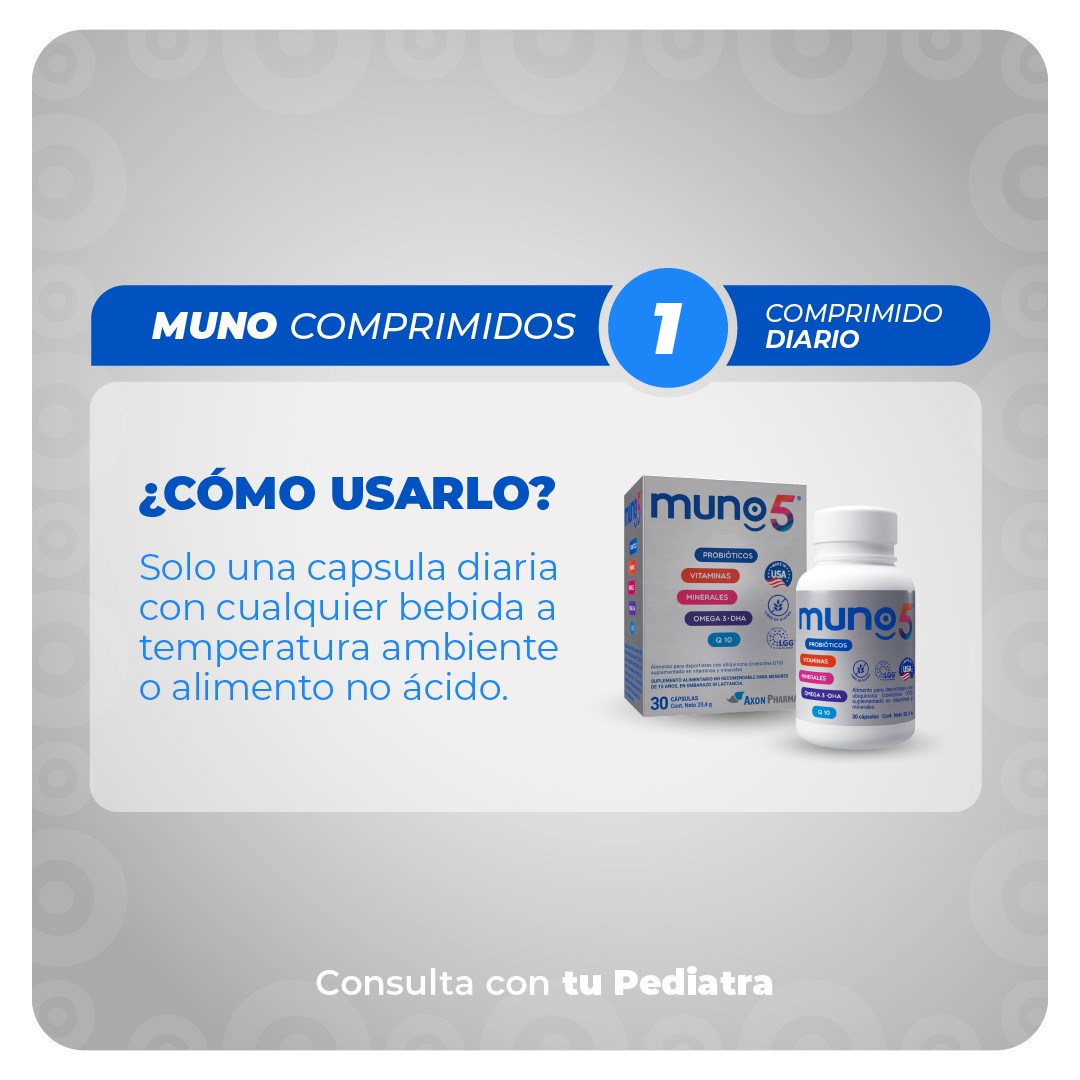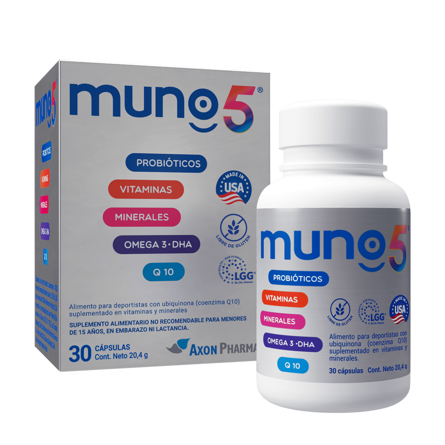 Muno 5 combina probiótico, vitaminas, minerales, omega 3 (DHA) y coenzima Q10 para ayudar a fortalecer tu sistema inmune, mejorar tu energía diaria y tu nutrición, beneficiándote así: