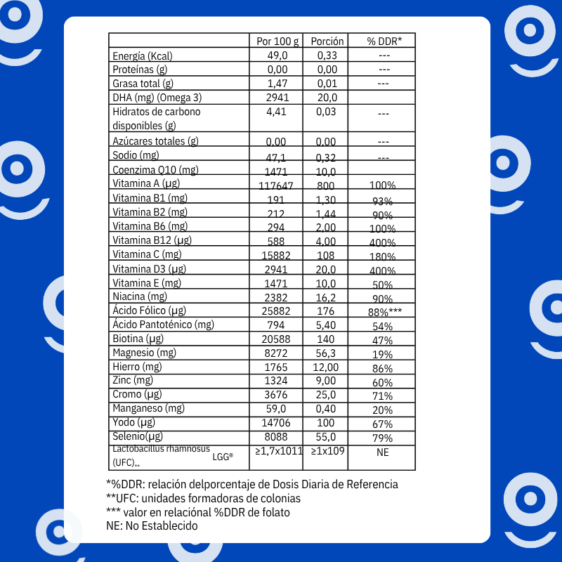 Alimento para deportistas en base a probióticos, minerales, Coenzima Q10, DHA y vitaminas que contribuye a reforzar el sistema inmune. Suplemento alimentario no recomendable para menores de 15 años, en embarazo ni lactancia.