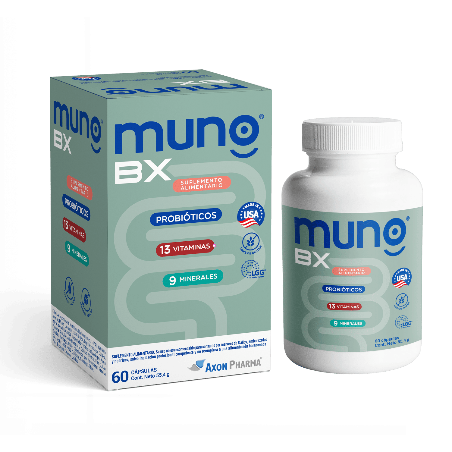 Muno BX es un suplemento alimentario en cápsulas diseñado para complementar la nutrición de personas que han pasado por una cirugía bariátrica como bypass gástrico o manga gástrica. Su fórmula incluye vitaminas, minerales y el probiótico LGG®, que ofrecen apoyo integral diario, fácil de digerir y adaptada a los cambios digestivos posteriores a este tipo de intervenciones.