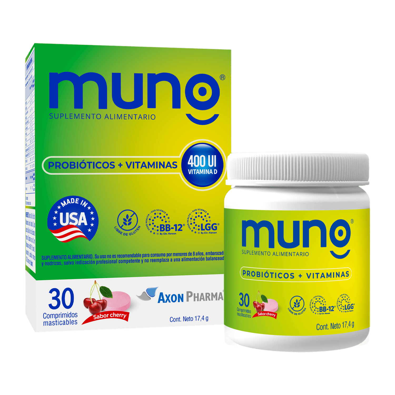 - Gracias a la combinación de dos probióticos (Lactobacillus rhamnosus GG® y Bifidobacterium lactis BB-12®), junto con vitaminas D y C, Muno Masticable ayuda a fortalecer sus defensas naturales, protegiéndolos de infecciones comunes y apoyando un sistema inmune saludable.
