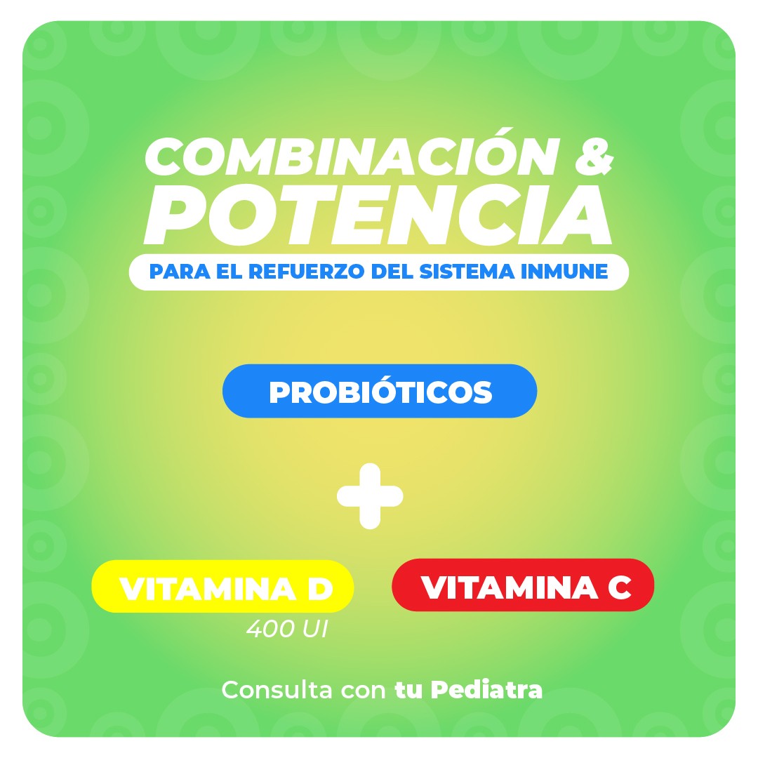 Probióticos con vitamina C y 400 UI de vitamina D en comprimidos con saber a cherry, fáciles de consumir.