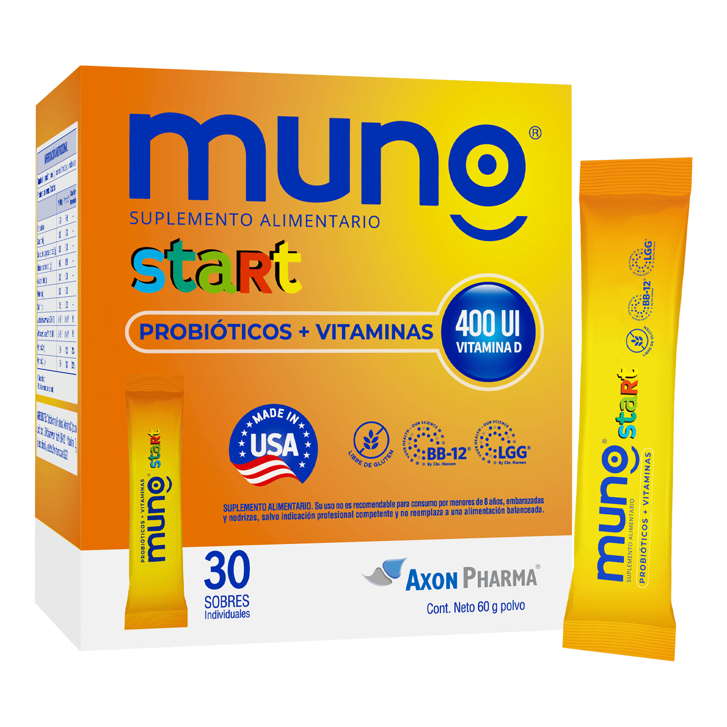 - Gracias a la combinación de dos probióticos (Lactobacillus rhamnosus GG ® y Bifidobacterium lactis BB-12 ®), junto con vitaminas D y C, Muno Start ayuda a fortalecer sus defensas naturales protegiéndolos de infecciones comunes, y apoyando un sistema inmune saludable.