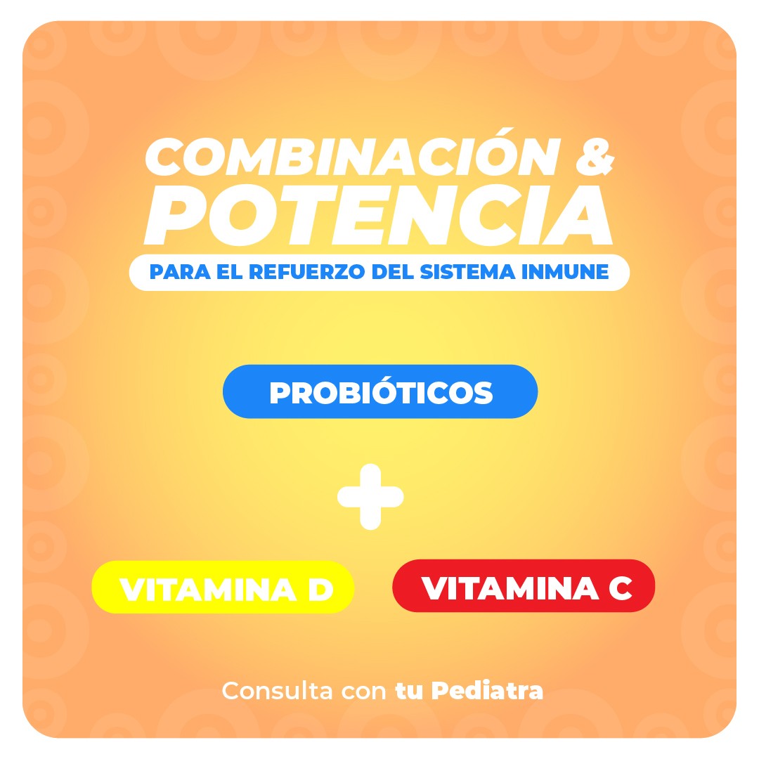 Para ayudar a reforzar el sistema inmunológico y regular la digestión de los más pequeños, ayudando a prevenir infecciones comunes y apoyar el crecimiento saludable con su combinación de probióticos y vitaminas D y C.